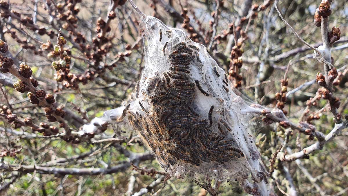 Het was te verwachten na zo’n zachte winter: in de duindoornstruiken zijn veel nesten te zien van de bastaardsatijnrups. De rupsen vreten de jonge blaadjes van de duindoorn en verlaten de struiken de komende tijd. De haren van de rups kunnen veel jeuk veroorzaken op de huid. Sommige mensen hebben er nauwelijks last van, maar anderen moeten naar de dokter voor een middeltje om de jeuk te bestrijden. Onlangs sprak ik een gast die er echt ziek van was geworden.