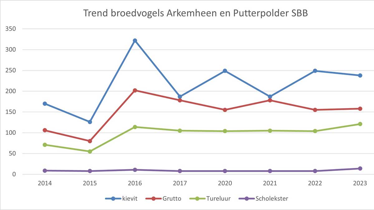 Doordat het gebied consequent op dezelfde wijze beheerd wordt met een stabiele broedpopulatie weidevogels blijven de vogels hier met grote getalen terug komen. Die stabiliteit is ook te zien bij de kievit, scholekster en tureluur (zie bovenstaande grafiek). Soorten die niet in dit overzichtje van 2023 staan weergegeven maar het erg goed doen in het gebied zijn de: