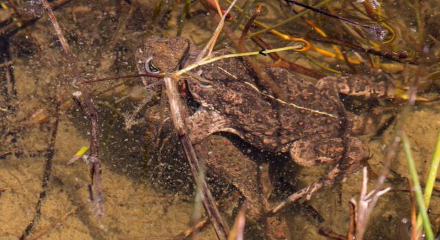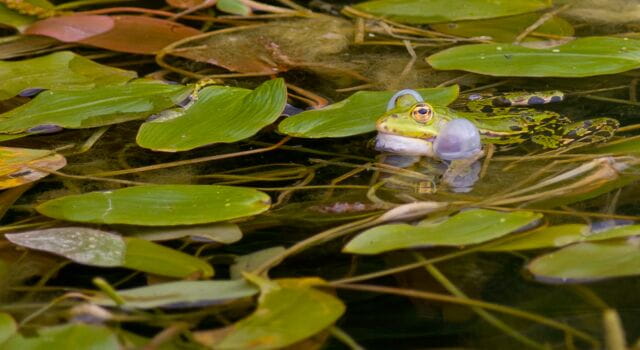 ‘Er zaten zeven kikkertjes al in een boerensloot’, zongen wij vroeger. Kom er nu nog maar eens om. De groene kikkers zijn uit de sloten bij ons in de omgeving veelal verdwenen door intensieve bemesting en lozing van afvalwater dat van alle kanten onze delta in stroomt. Het is niet, zoals het lied stelt, de kou die het kikkerkoor de das om heeft gedaan. Voor een beetje kikkerkoor kun je tegenwoordig beter een flinke vijver in je tuin graven of een poel in het landschap. Afgesloten van de vervuilde stromen die mensen veroorzaken, komen ze dan nog een tot een kikkerlied. Met hun dubbele kwaakblazen is het op een zwoele avond een mooie wedstrijd hard zingen.