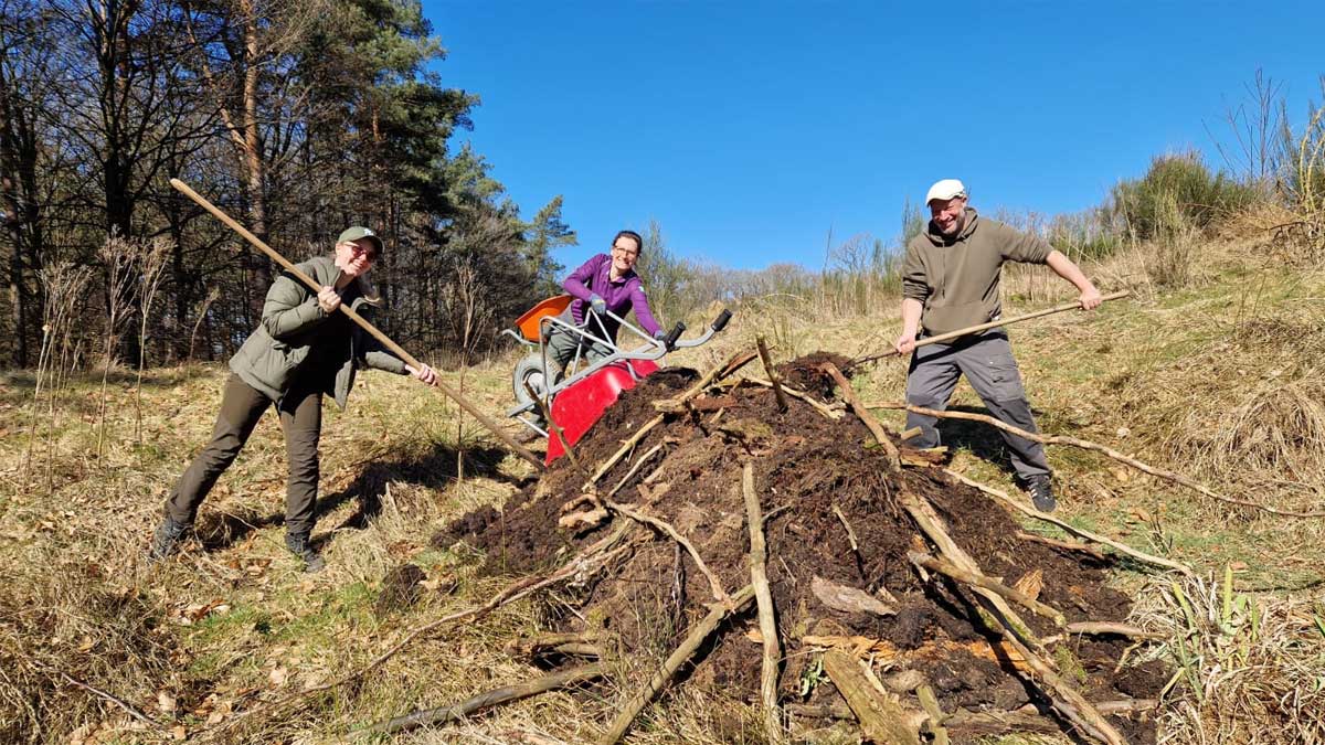 Wij hebben, in samenwerking met RAVON*, onlangs verschillende broeihopen gemaakt. Deze bestaan uit takken, maaisel en paardenmest. Hierin kan het vrouwtje van de ringslang in juni haar eieren leggen. De warmte die ontstaat in de broeihoop kan oplopen tot wel 30 graden, waardoor de eieren automatisch uitgebroeid worden. Midden augustus komen de jongen uit het ei.