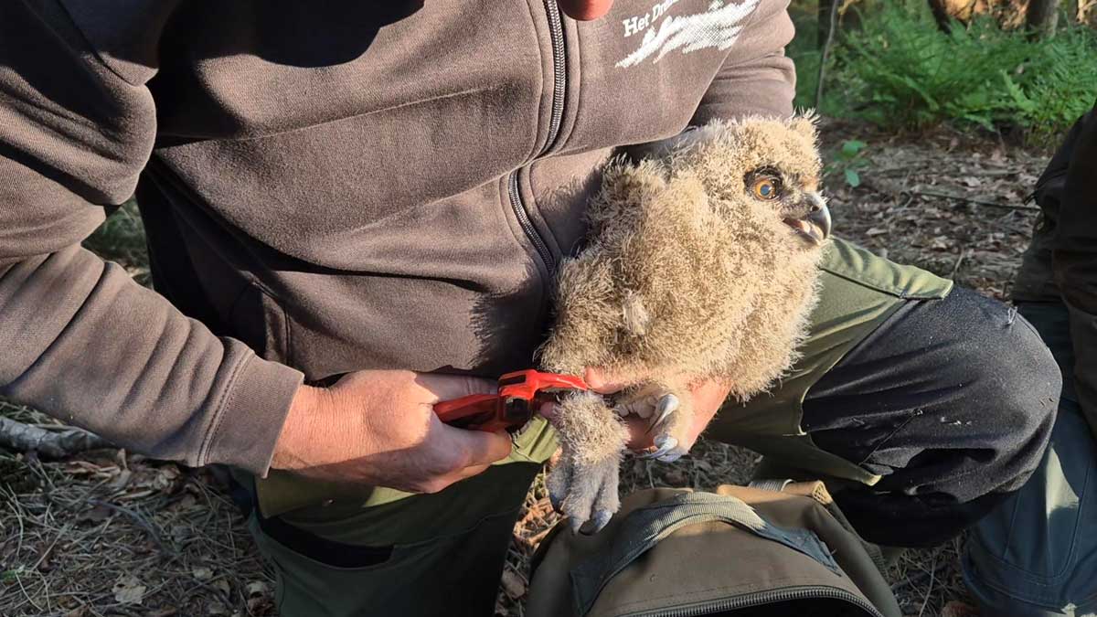Eerder was ik weleens mee geweest met het ringen van steenuilen – ons kleinste uiltje in Nederland – maar dit was van een andere orde. De oehoe is geen vogel die je even snel tussen de dakpannen vandaan haalt. De route naar het nest was al bijzonder: tussen de bomen door viel plotseling een schaduw over ons heen. Even later zagen we waar die vandaan kwam. Een grote uil vloog geruisloos door de lucht en verdween in een boom. Als we niet precies wisten welke boom het was, hadden we hem nooit meer gevonden. Razendsnel klapte hij zijn vleugels in en drukte zich tegen de stam, onzichtbaar voor een argeloze wandelaar. Een meester in camouflage.