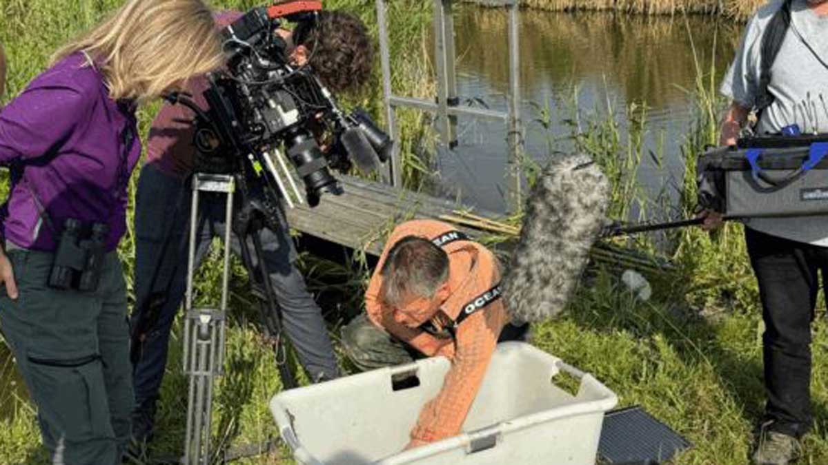 De dag van het fuiken legen is een speciale dag, want de cameraploeg van het TV-programma BinnensteBuiten komt met ons meekijken. Best spannend! Zij zijn speciaal geïnteresseerd in de vispassage bij de Kitstocht. Ze willen graag meer weten over wat voor vissen gebruik maken van deze passage, en over het belang ervan. Daarom begint de dag met het legen van de fuiken die we de vorige dag daar hebben neergezet. In de fuik bovenaan de passage vinden we bijvoorbeeld jonge baars: dit zou een goede aanwijzing kunnen zijn dat jonge baars het gebied in trekt om daar verder op te groeien. In de fuik beneden zitten vooral grondels en zeelt, typisch niet-trekkende soorten. Een interessante vangst dus! Nadat onze vangst goed op camera staat en Joep heeft kunnen vertellen over alle vissoorten die we in onze fuiken hebben gevonden, gaat de cameraploeg zonder ons verder naar een ander deel van de Oostvaardersplassen om vogels te spotten.