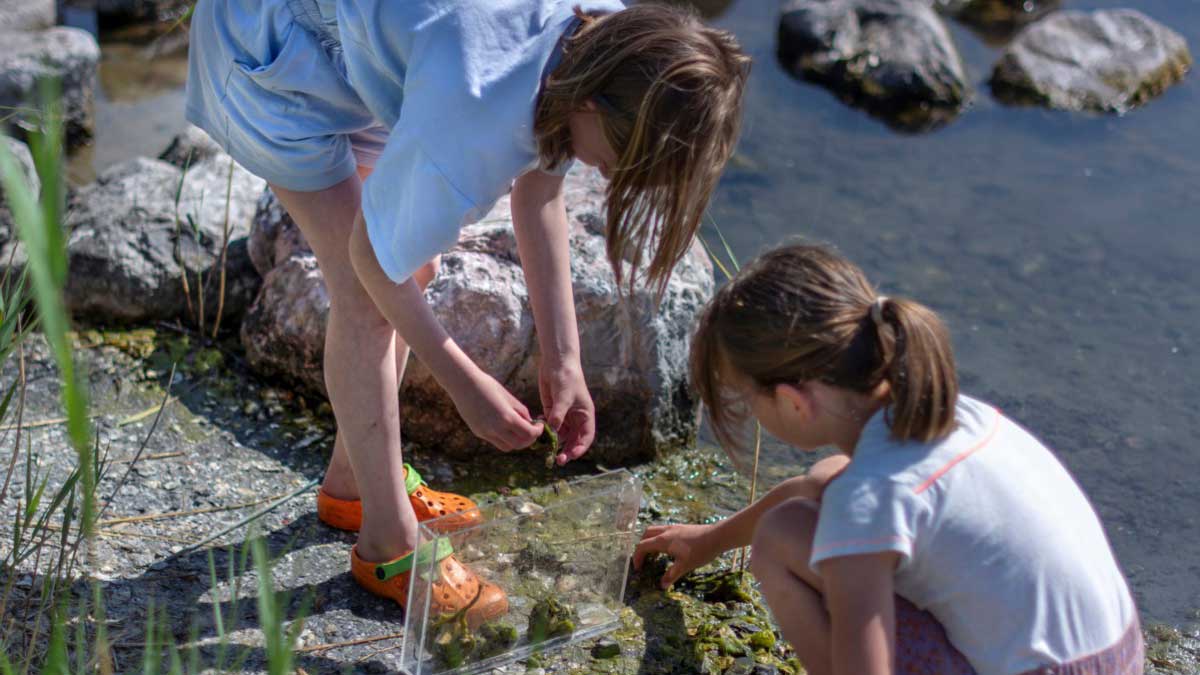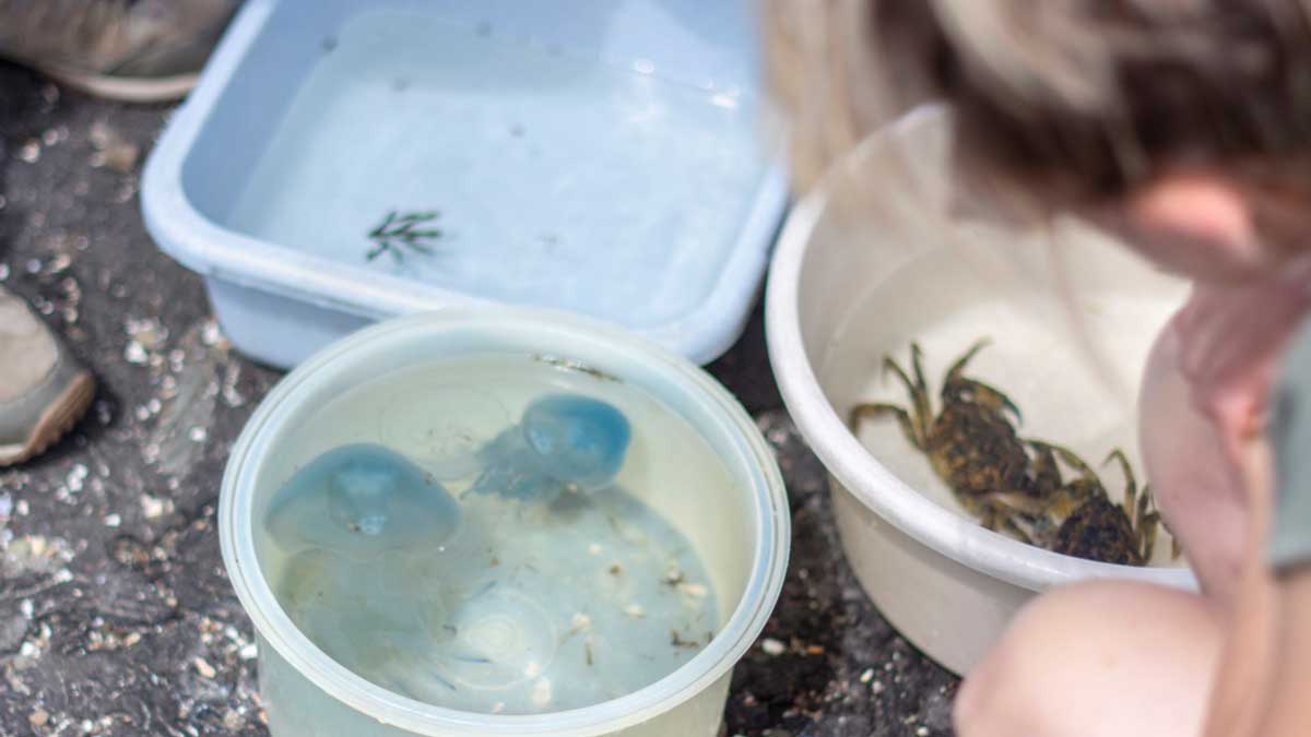 Tijdens een afwisselend programma met verschillende ‘posten’ leren de kinderen uit groep 5 en 6 over de natuur boven én onder water. Er is niet veel nodig om hun nieuwsgierigheid te prikkelen. Het zoeken naar krabben en kwallen met een onderwaterkijker vanaf de steiger is altijd een favoriet onderdeel. En wie durft de krab daarna ook vast te houden? “Aan de vorm van het buikschild kun je zien of het een mannetje of vrouwtje is,” legt een vrijwilliger uit. De kinderen maken ook kunst met natuur: zeewierschilderijen in cuvetten, doorzichtige bakken waarin ze de planten goed kunnen bekijken. En langs de waterkant worden met schepnetjes waterdiertjes zoals vlokreeftjes en garnalen uit het water gezeefd en bestudeerd.