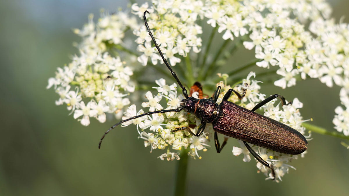 Daar waar de rupsen leven van hout, leven de kevers vooral van nectar. Schermbloemen, met name de gewone berenklauw, zijn erg in trek. Gewone berenklauwen(niet te verwarren met de exotische reuzenberenklauw) zijn nectarkroegen die volop bloeien op de rijke Biesboschgrond! Vooral langs wandelpaden kom je ze veel tegen. Loop je bijvoorbeeld een rondje over het Laarzenpad vanaf het Biesbosch Museumeiland of langs de wandeling Deenenplaatweg, dan kom je deze fraaie witte schermbloemen overal tegen. Waar je dan ook kijkt kruipen en zoemen er insecten die zich tegoed doen aan deze nectarbommen. Voor veel soorten vormen deze berenklauwen de hoofdvoedselbron in de zomermaanden. Tussen alle kleine weekschildkevertjes kom je dan ook regelmatig zo’n fraai slagschip van een muskusboktor tegen.