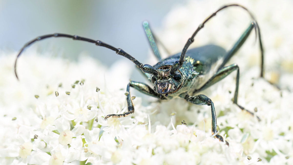 Schijnt de zon, dan verschijnt er op deze metallic boktor een regenboog aan kleuren. Groen, blauw, paars, oranje, het is maar net vanuit welke hoek je tegen het insect aan kijkt. De maand juli is de maand waarop deze kevers pieken.