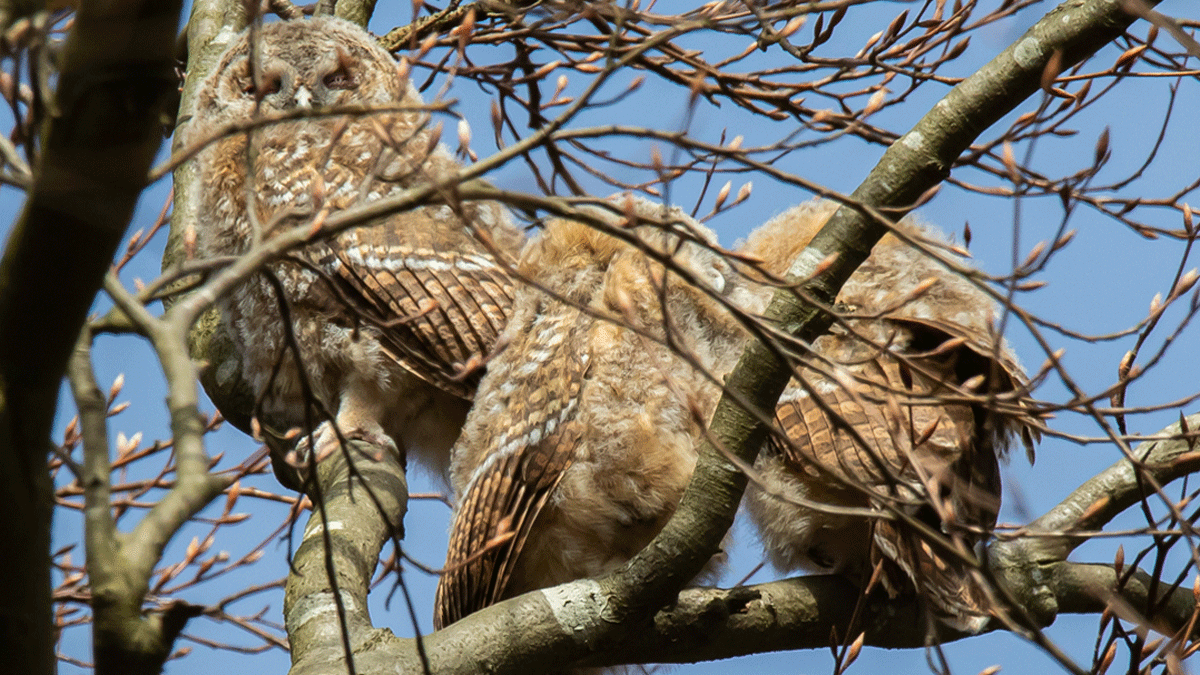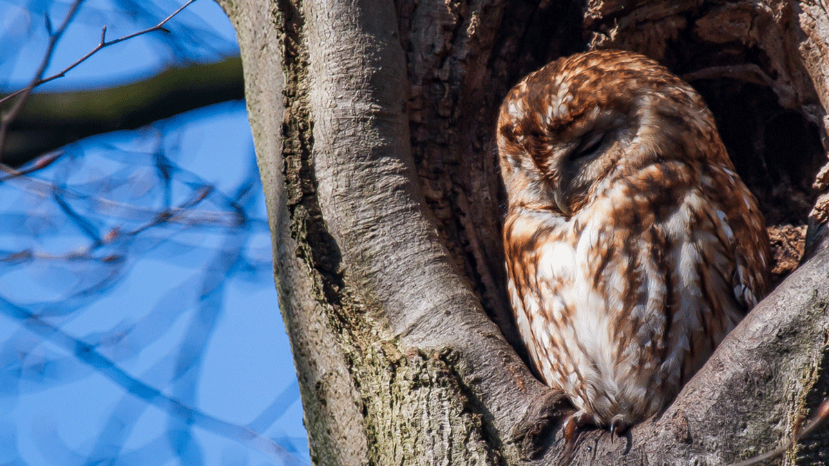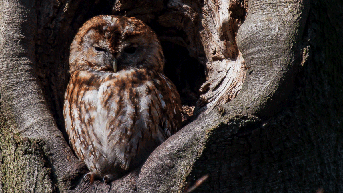 Ik schrik. Stap achteruit. Grijp mijn camera. Met veel misbaar klautert een dier omhoog in de holle stam. Hoog boven me lijkt de boom te exploderen. Veren fladderen rond, gekrijs klinkt, een grote bruine vogel knalt uit de boom. Pas als het dier enige afstand heeft afgelegd krijg ik haar in beeld. Een bosuil.