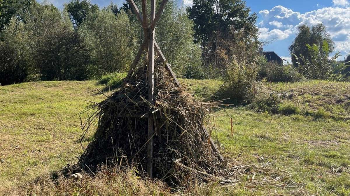 Een bijenruiter is kortgezegd een soort tipi van takken met een vulling. Misschien heb je weleens een broeihoop voor ringslangen gezien of een muizenruiter? Daar lijkt het een beetje op, maar net een tikkeltje anders. De vulling bestaat uit drie lagen; een onderste luchtdoorlatende laag van gras, takken en stenen, een tweede laag bevat voornamelijk holle stengels en de toplaag bestaat uit alleen maar riet. Je merkt al, die holle stengels zijn een terugkerend materiaal in de bijenruiter.